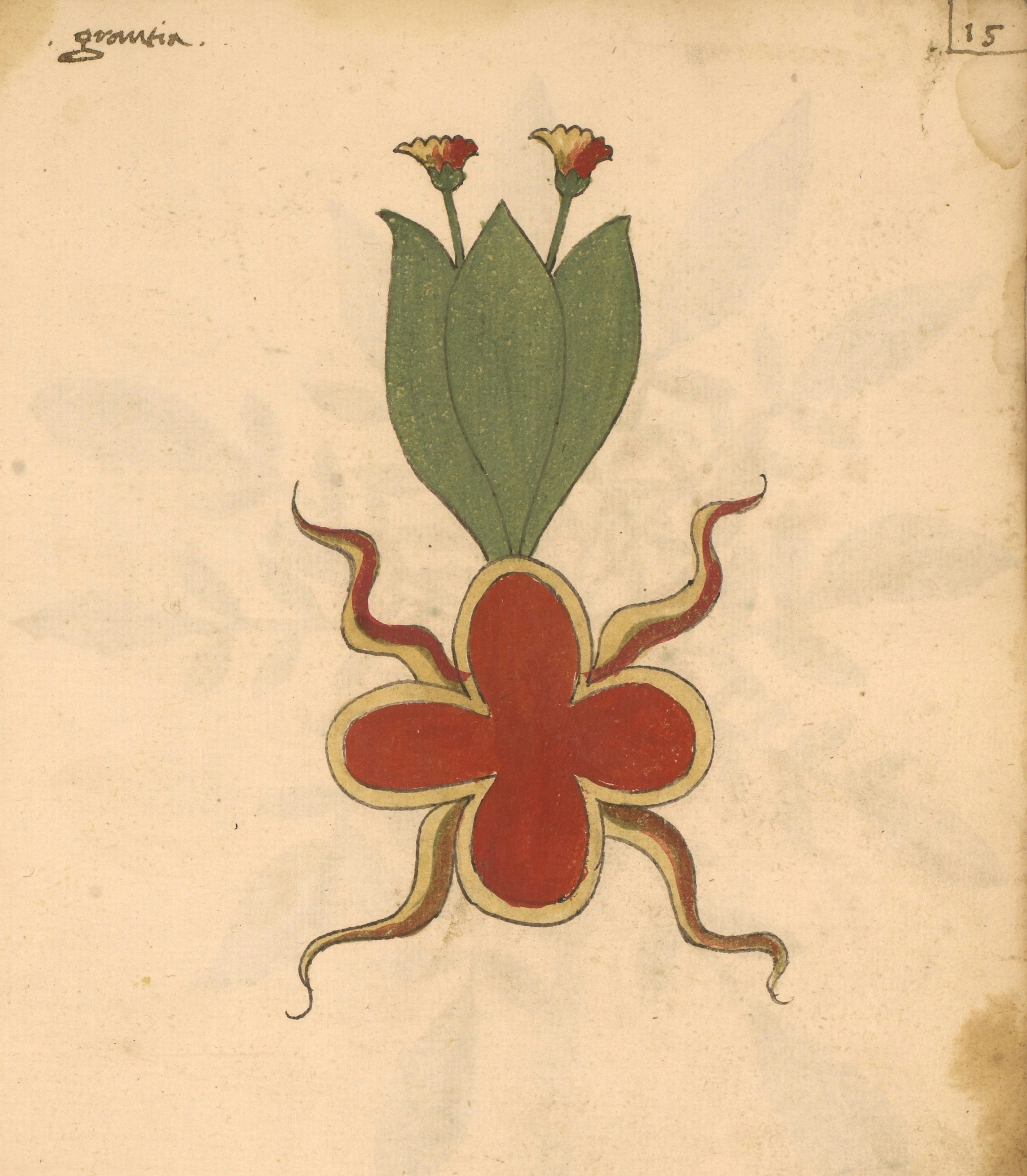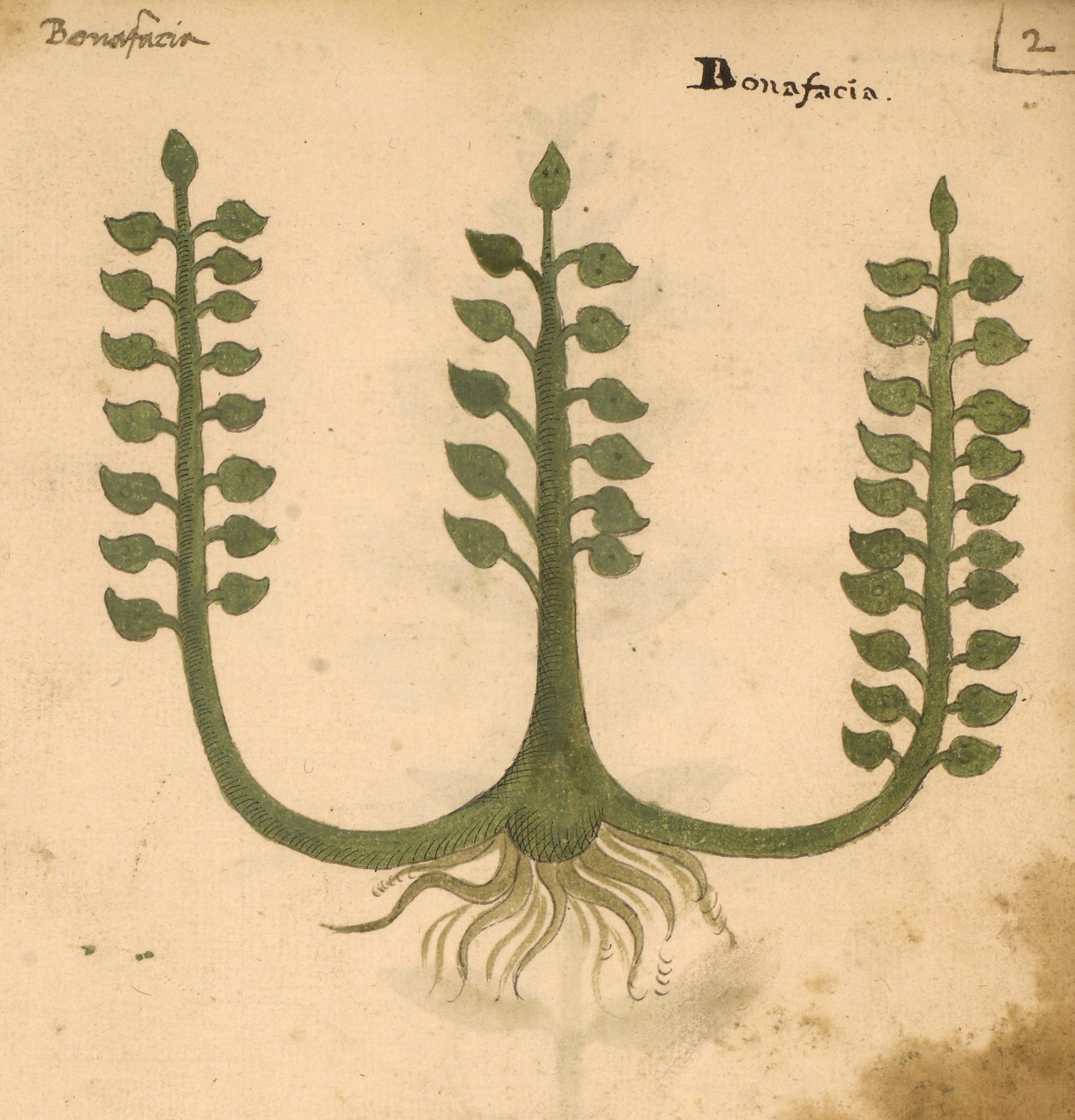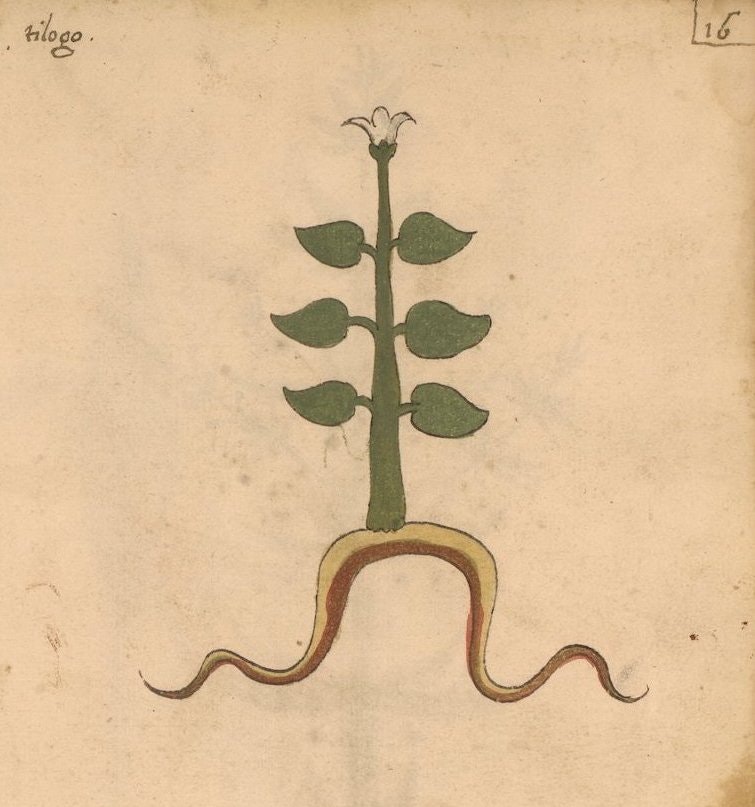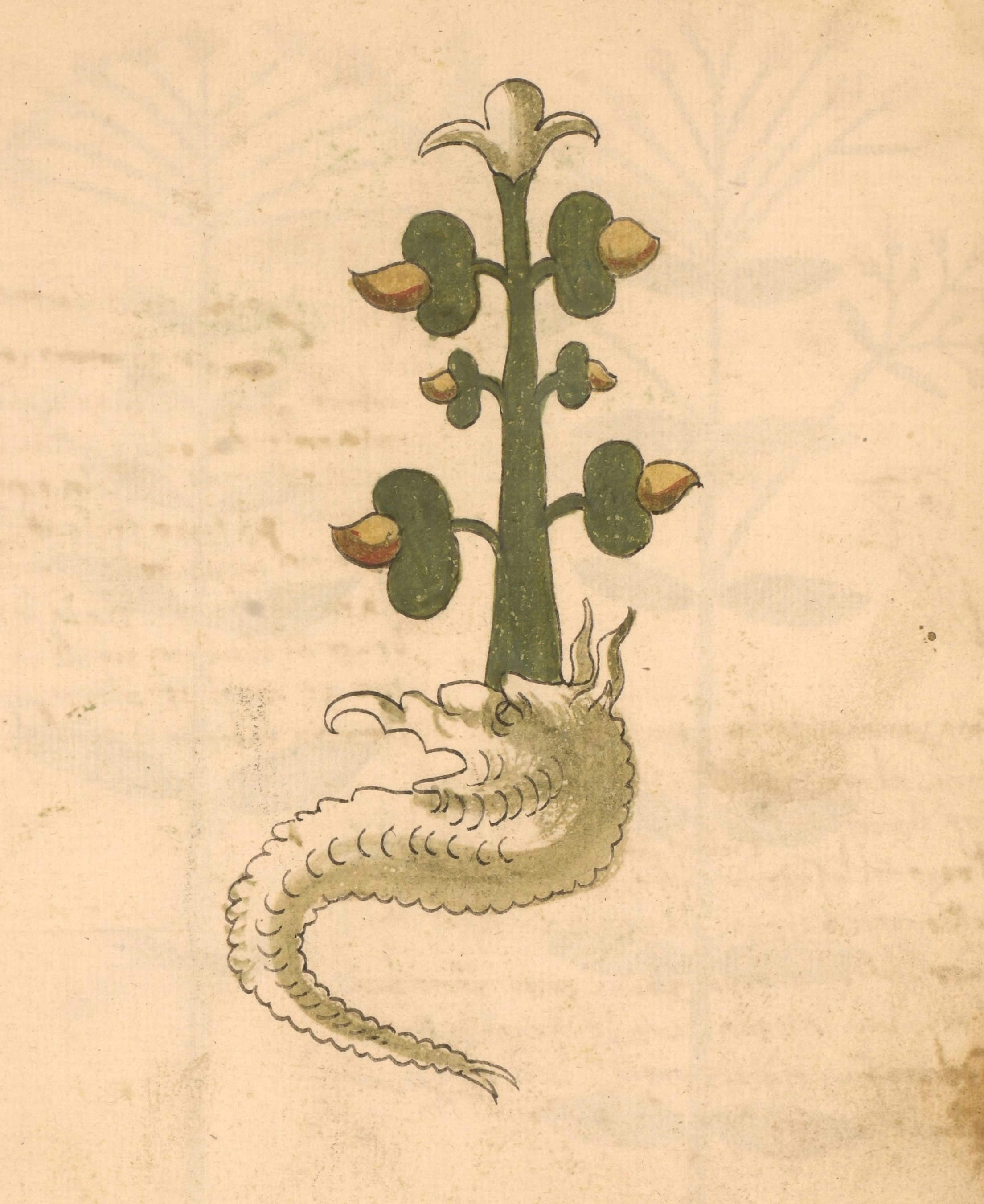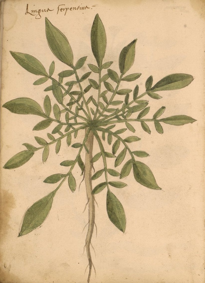 At the end of the manuscript, there is a "nature print" of a leaf labeled Salvia salvaticha, indicating the work of the same person who added the second set of illustrations. While the original set with anthropomorphized plants and dragon-shaped roots is the focus here, the full range of styles can be explored on the Penn Libraries website (Ms. LJS 419).