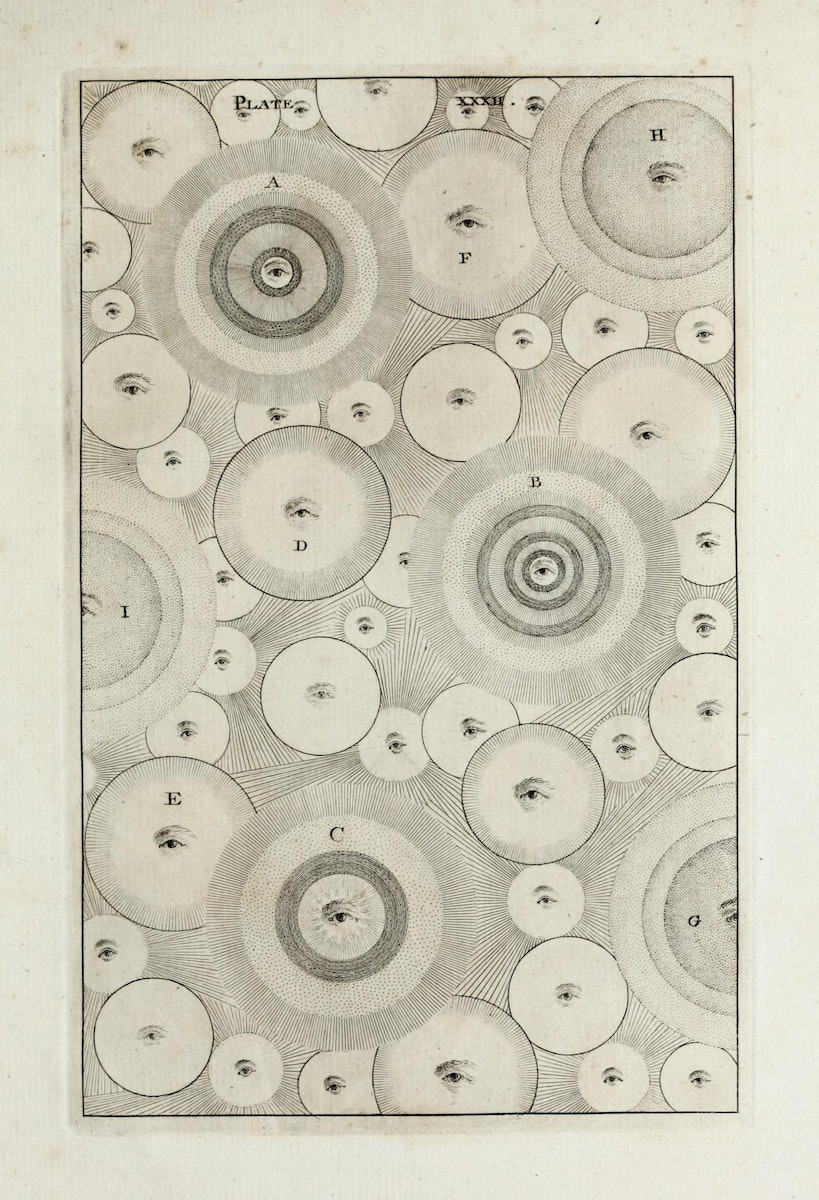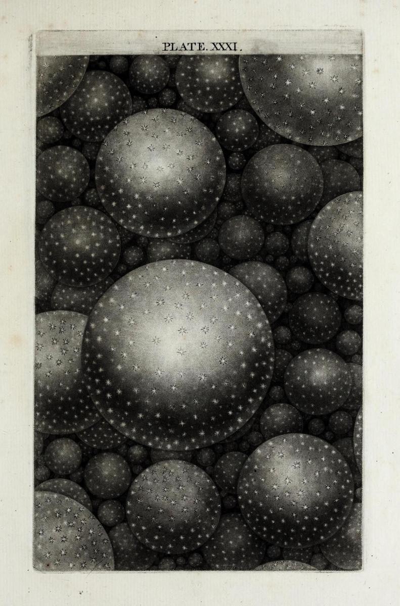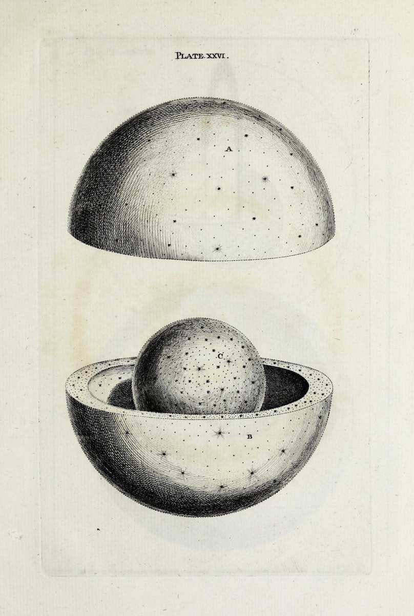 Born in 1711 in County Durham, Wright was a polymath skilled in mathematics, science, and the arts. He is best known for his work as a garden designer, and his only other published book is a study of the antiquities of County Louth, Ireland. Wright’s An Original Theory includes 32 plates illustrating his ideas, ranging from simple observations of the night sky to more complex diagrams of the universe's structure.