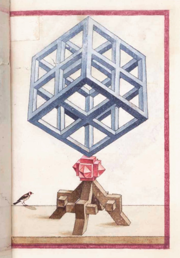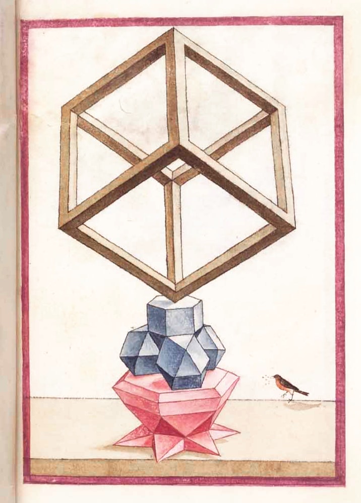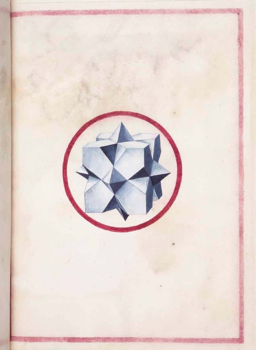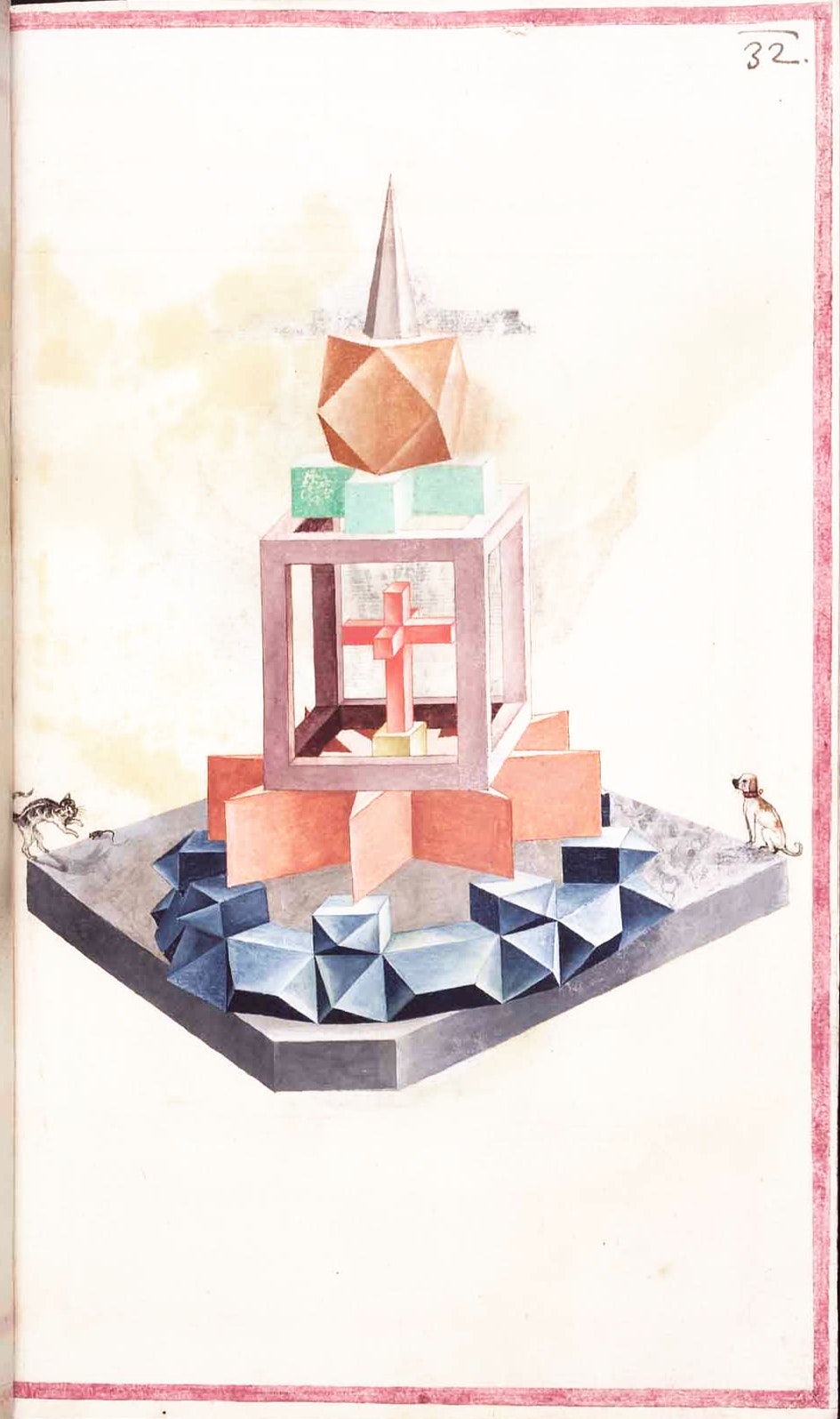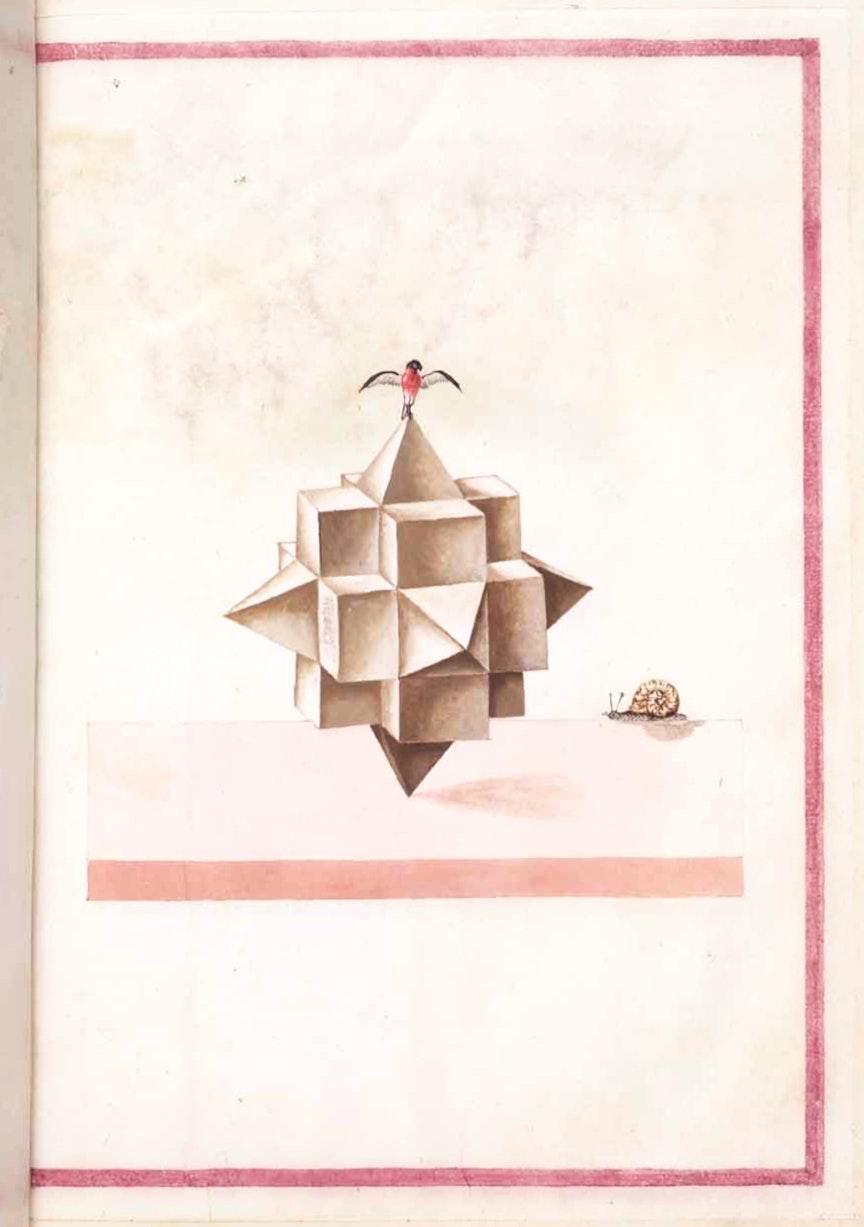Solid Objects is a mysterious 16th-century watercolor manuscript of geometric and perspective drawings, housed in the Herzog August Bibliothek. With no known author, title page, or commentary, the manuscript offers a visually striking sequence of increasingly complex shapes — from pyramids and cubes to compound polyhedra and surreal arrangements. While its origins remain unclear, its style links it to the work of Jamnitzer, Dürer, and other Renaissance figures captivated by geometry and the divine order it was believed to reveal.