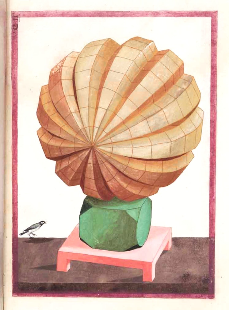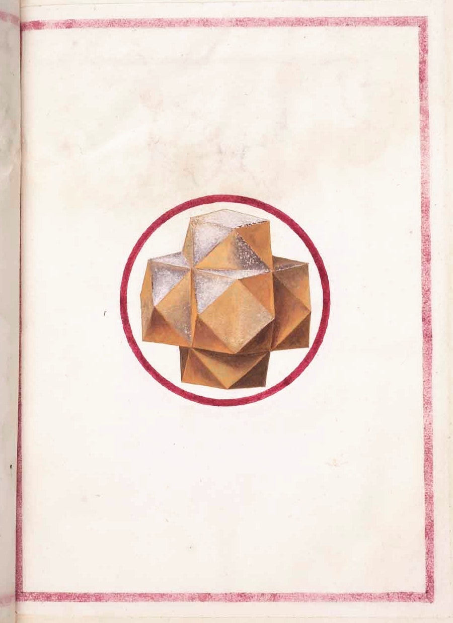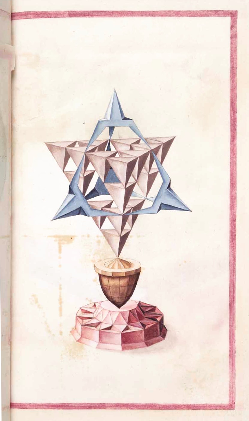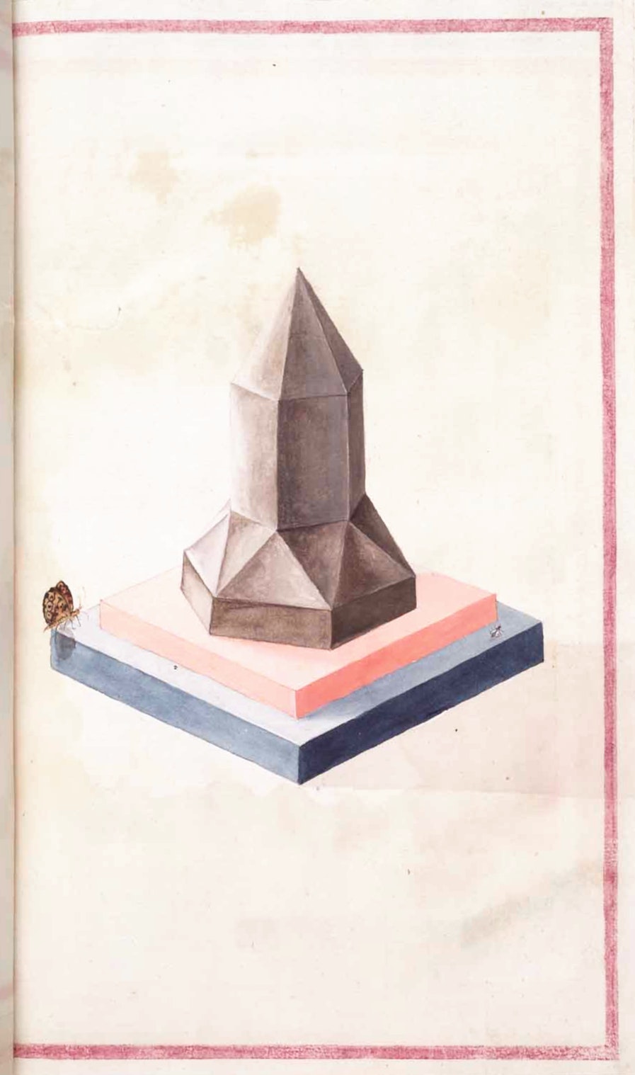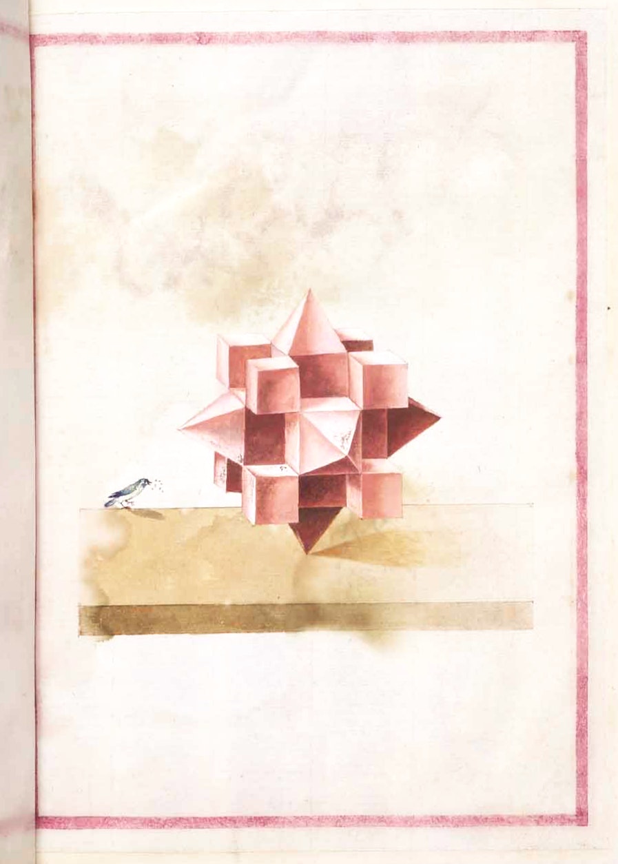 Solid Objects is a mysterious 16th-century watercolor manuscript of geometric and perspective drawings, housed in the Herzog August Bibliothek. With no known author, title page, or commentary, the manuscript offers a visually striking sequence of increasingly complex shapes — from pyramids and cubes to compound polyhedra and surreal arrangements. While its origins remain unclear, its style links it to the work of Jamnitzer, Dürer, and other Renaissance figures captivated by geometry and the divine order it was believed to reveal.