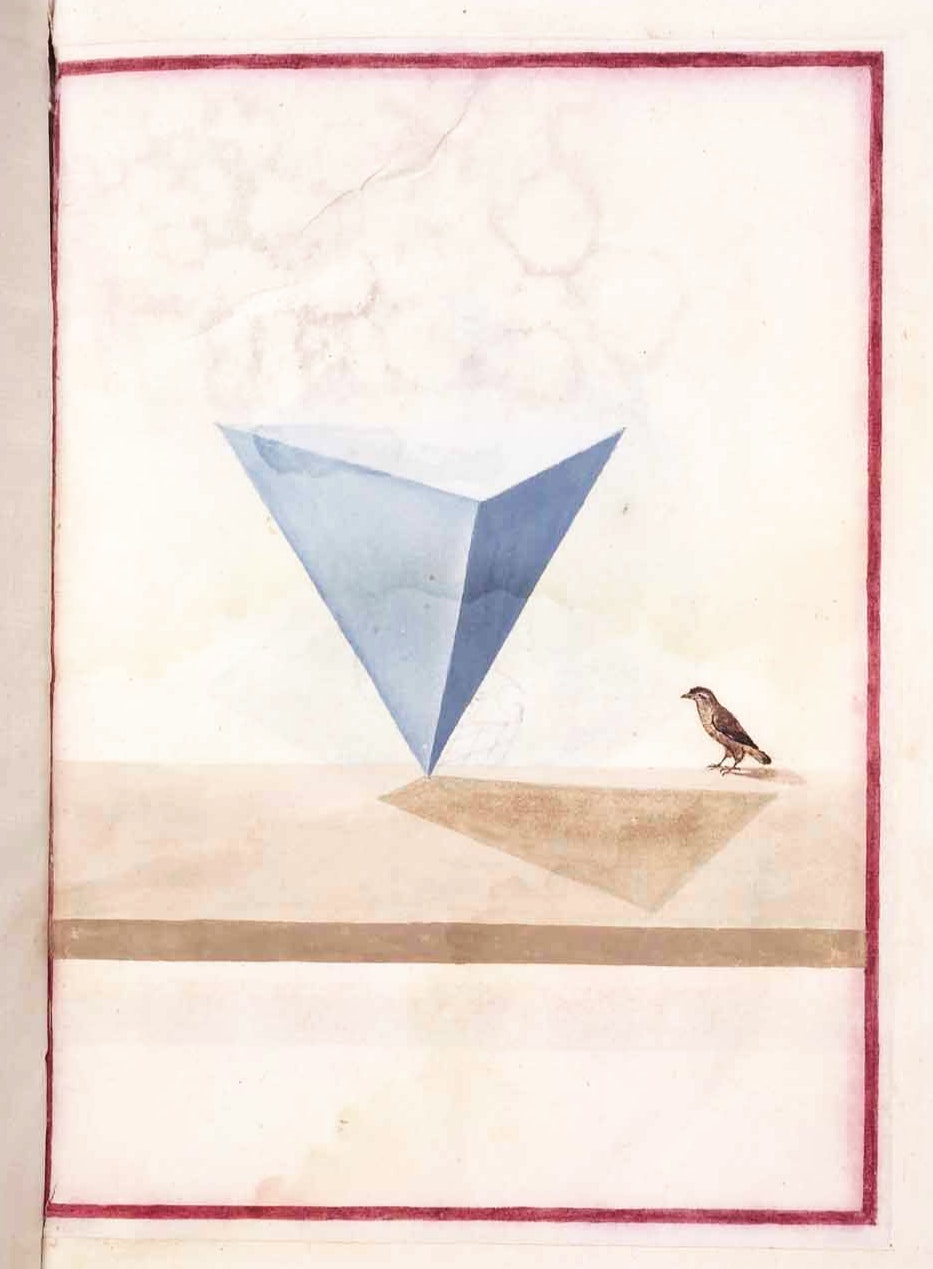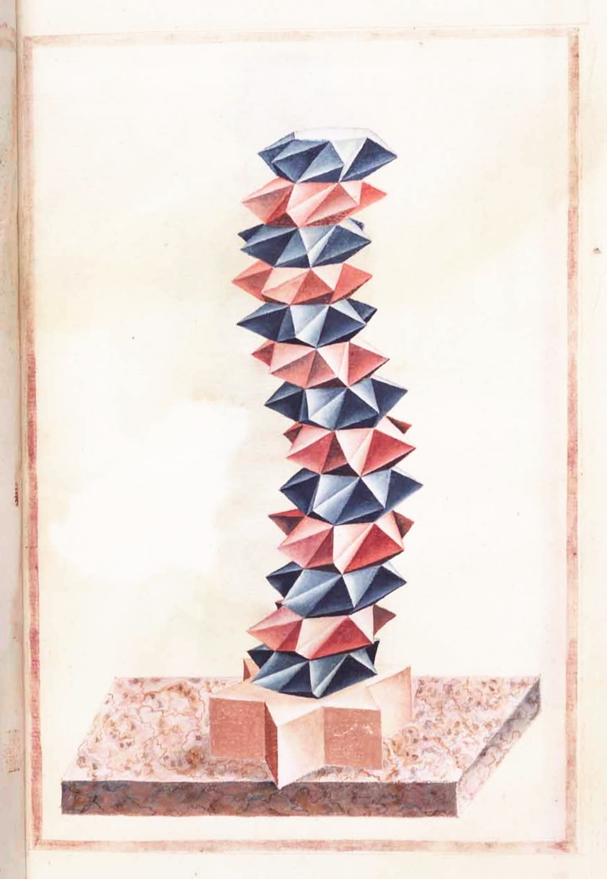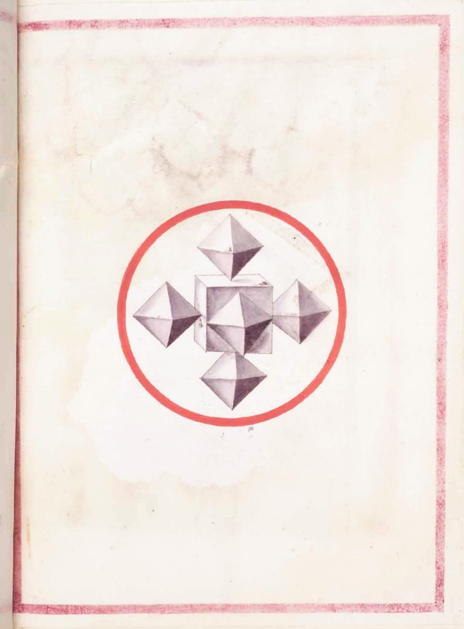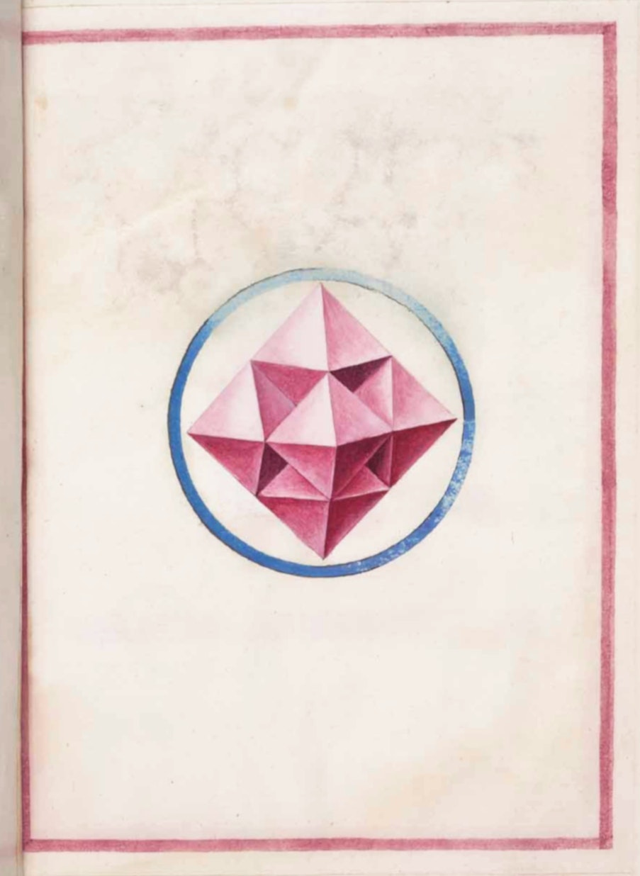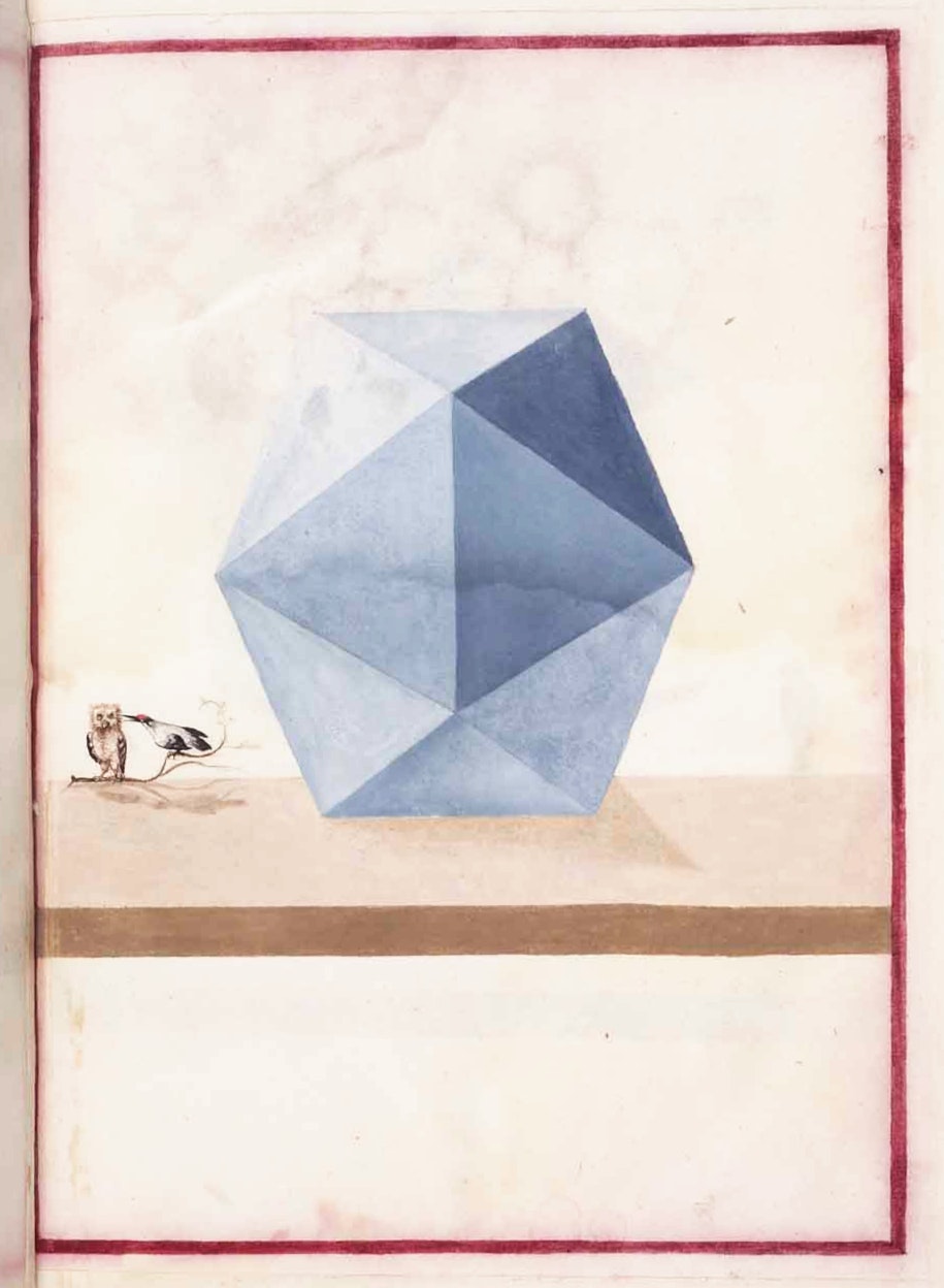 Solid Objects is a mysterious 16th-century watercolor manuscript of geometric and perspective drawings, housed in the Herzog August Bibliothek. With no known author, title page, or commentary, the manuscript offers a visually striking sequence of increasingly complex shapes — from pyramids and cubes to compound polyhedra and surreal arrangements. While its origins remain unclear, its style links it to the work of Jamnitzer, Dürer, and other Renaissance figures captivated by geometry and the divine order it was believed to reveal.