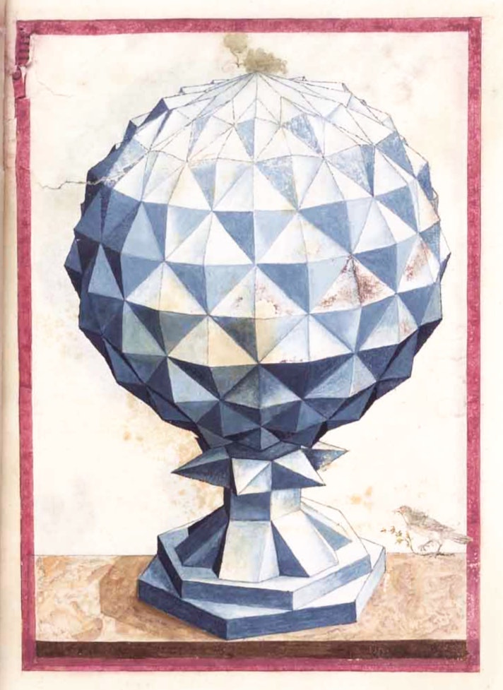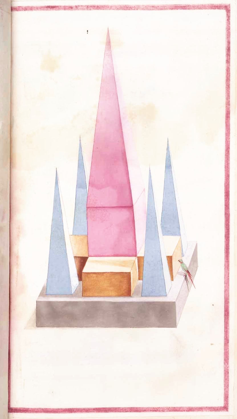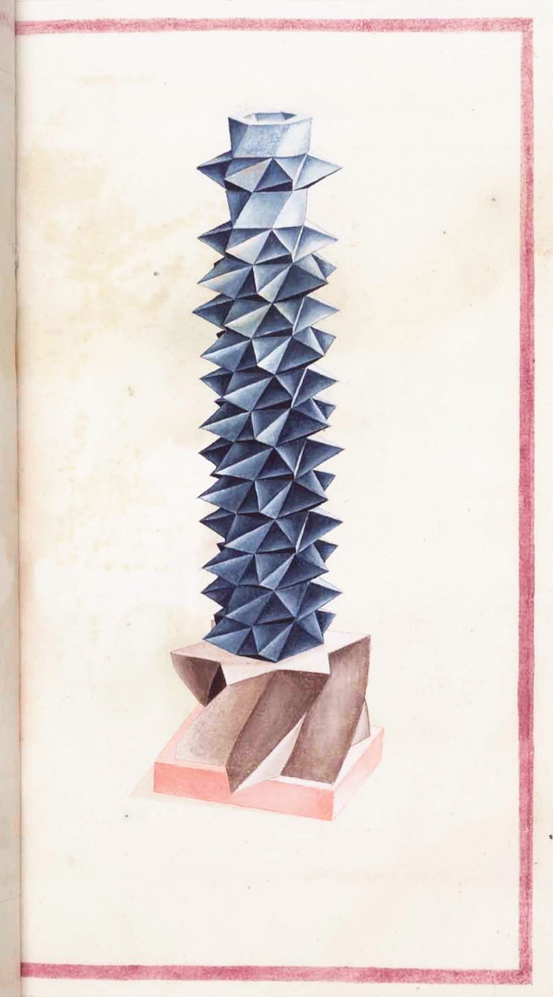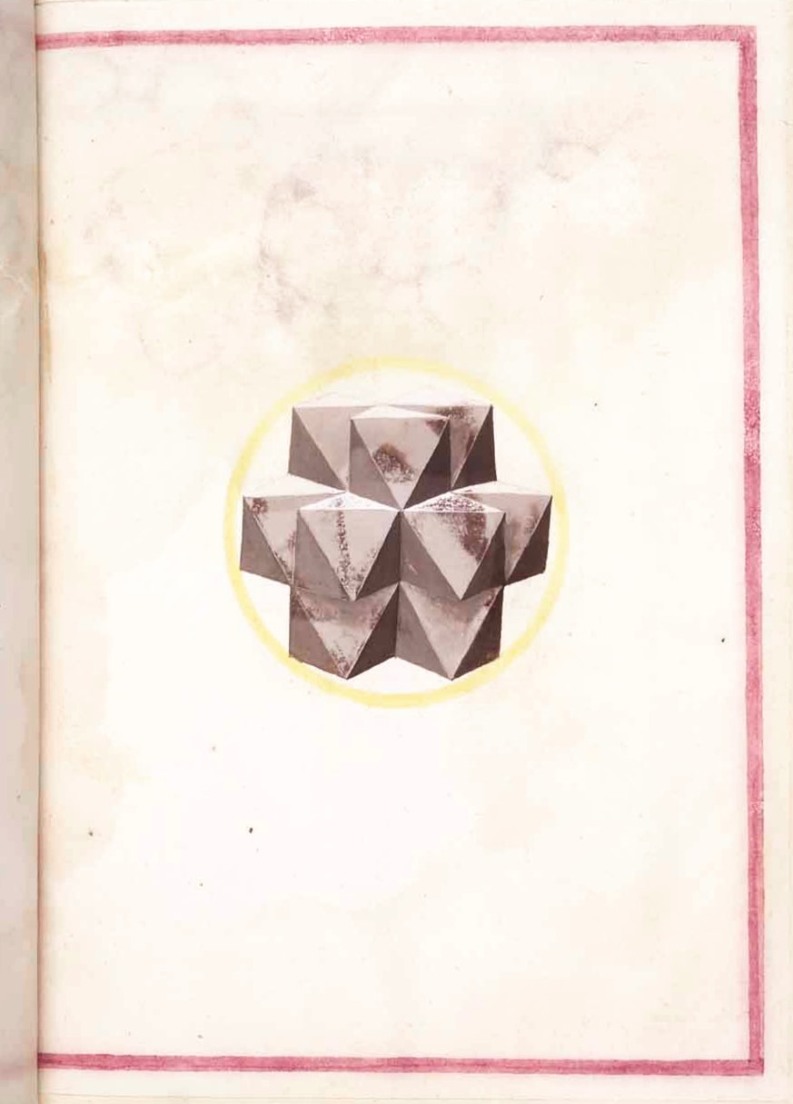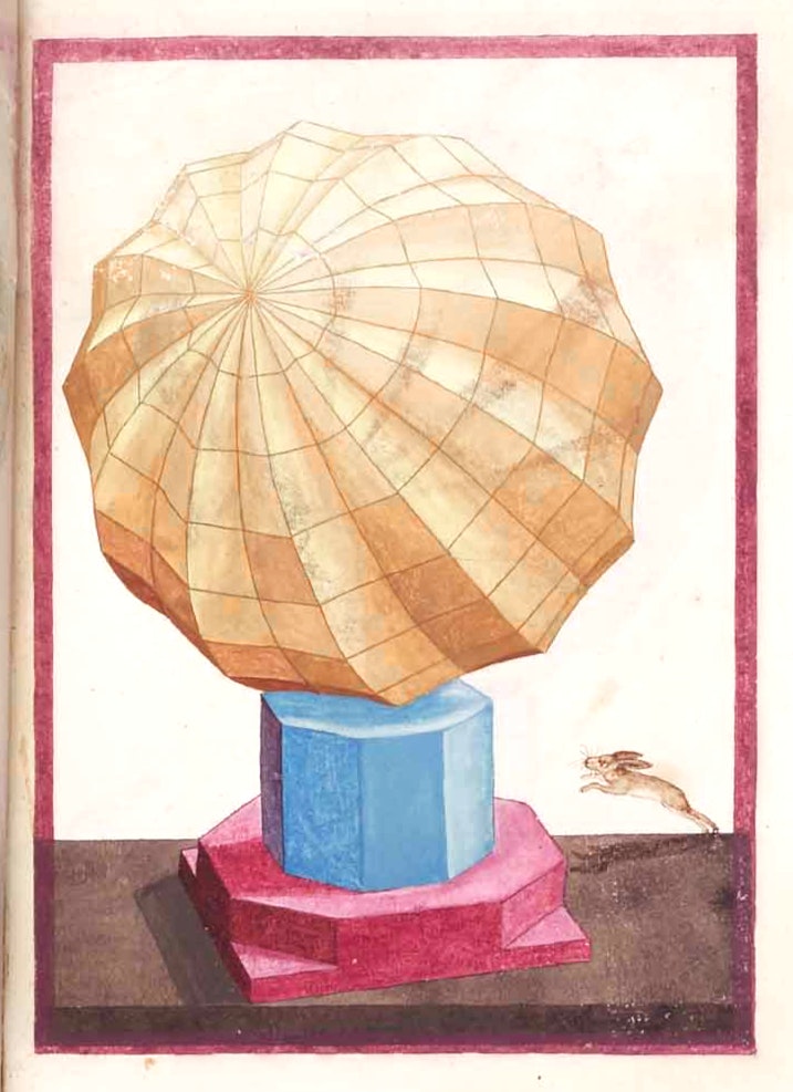 Solid Objects is a mysterious 16th-century watercolor manuscript of geometric and perspective drawings, housed in the Herzog August Bibliothek. With no known author, title page, or commentary, the manuscript offers a visually striking sequence of increasingly complex shapes — from pyramids and cubes to compound polyhedra and surreal arrangements. While its origins remain unclear, its style links it to the work of Jamnitzer, Dürer, and other Renaissance figures captivated by geometry and the divine order it was believed to reveal.