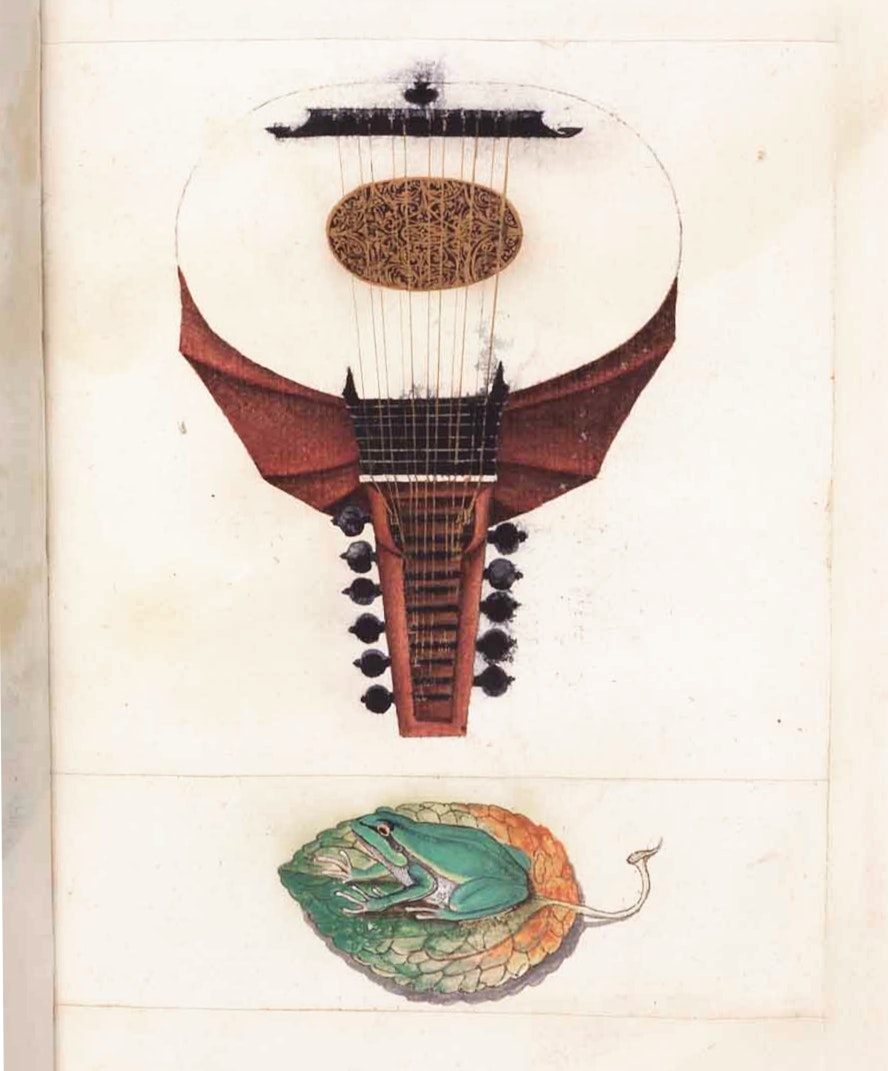 The drawings exhibit an internal logic, building from simple solids to intricate constructions that blend mathematical rigor with artistic elegance. As the figures grow more elaborate, they gain realistic staging: a grooved sphere rests on a jade-like barrel; a pastel pyramid evokes an ancient city; even a realistic lute floats above a lily pad. The final images merge sacred and secular — culminating in an open red book displaying a cross — and suggest that geometry, even in its purest forms, holds both spiritual and artistic power.