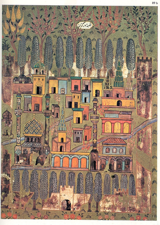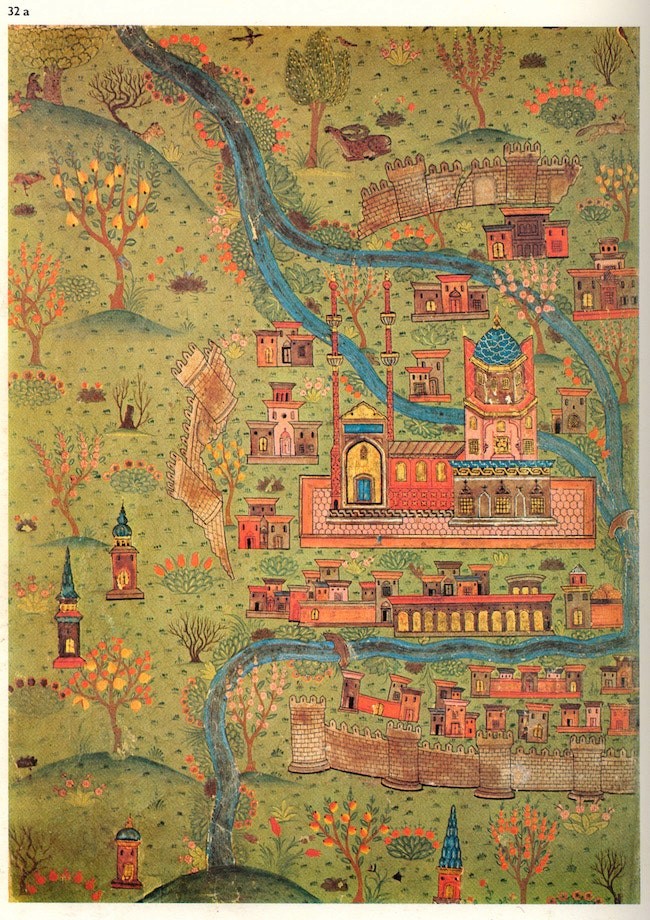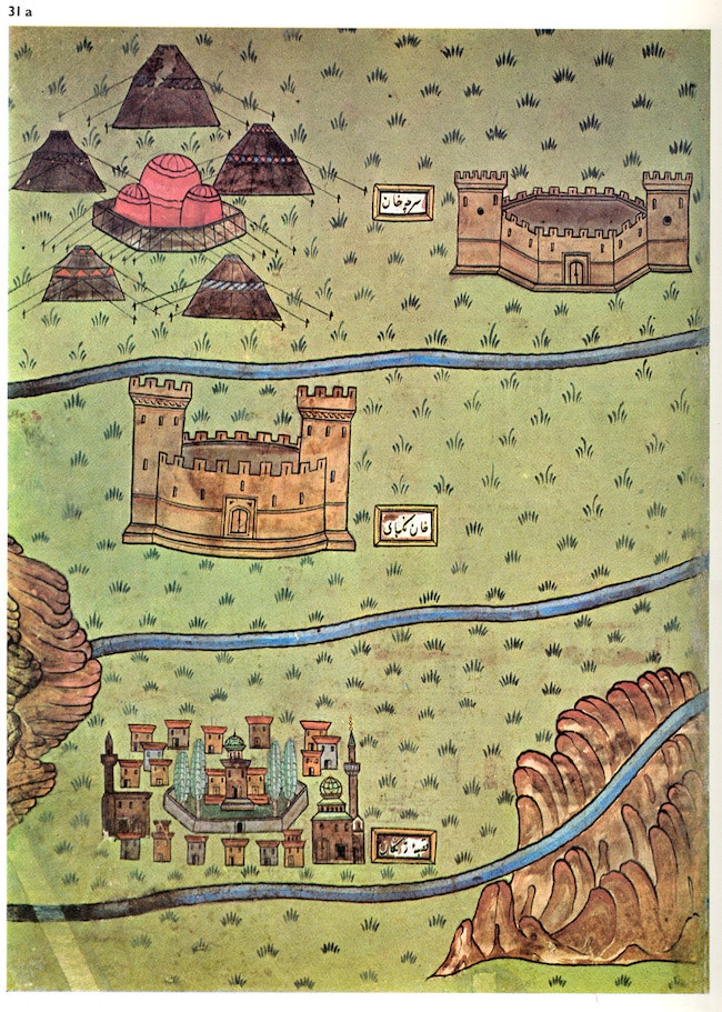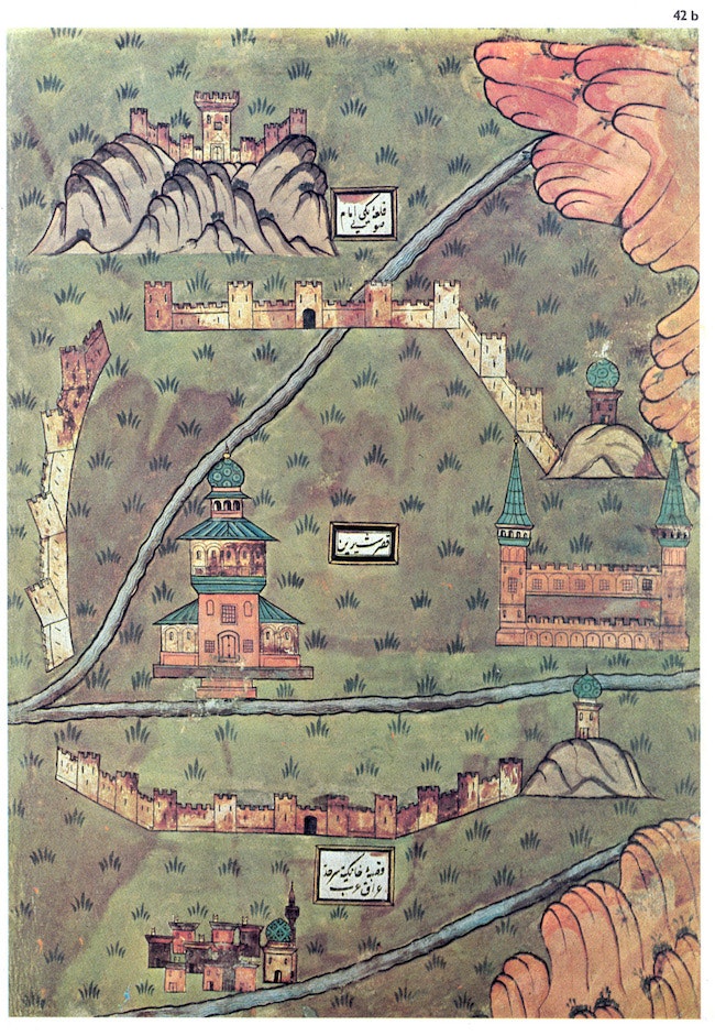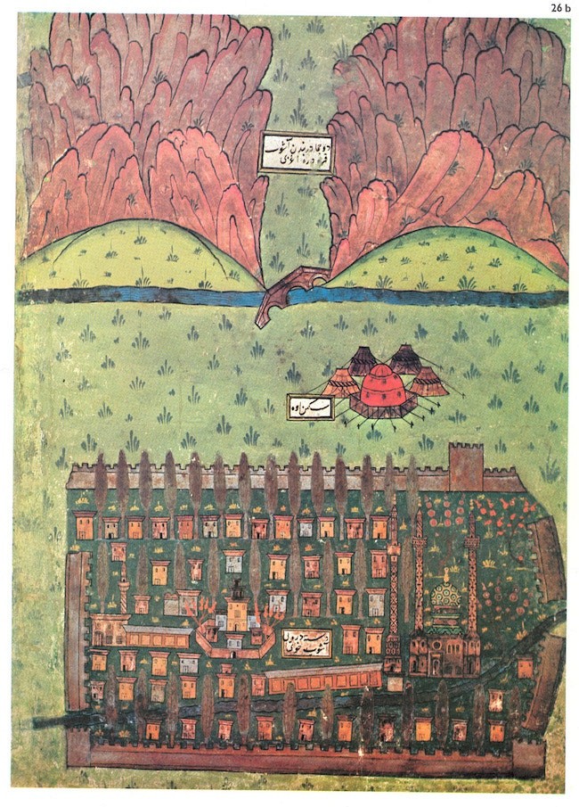 Matrakçı Nasuh, a Bosnian-born polymath, is renowned for his contributions to both mathematics and history, as well as for his stunning miniatures depicting 16th-century Persian landscapes and urban centers. His most important work, Fetihname-i Karabuğdan, is housed at the Istanbul University Library and chronicles Suleiman the Magnificent's Safavid War (1532–1555). In this work, Matrakçı Nasuh illustrates the cities the Ottoman army passed through, from Istanbul to Baghdad, Tabriz, Halab, and Eskisehir.
